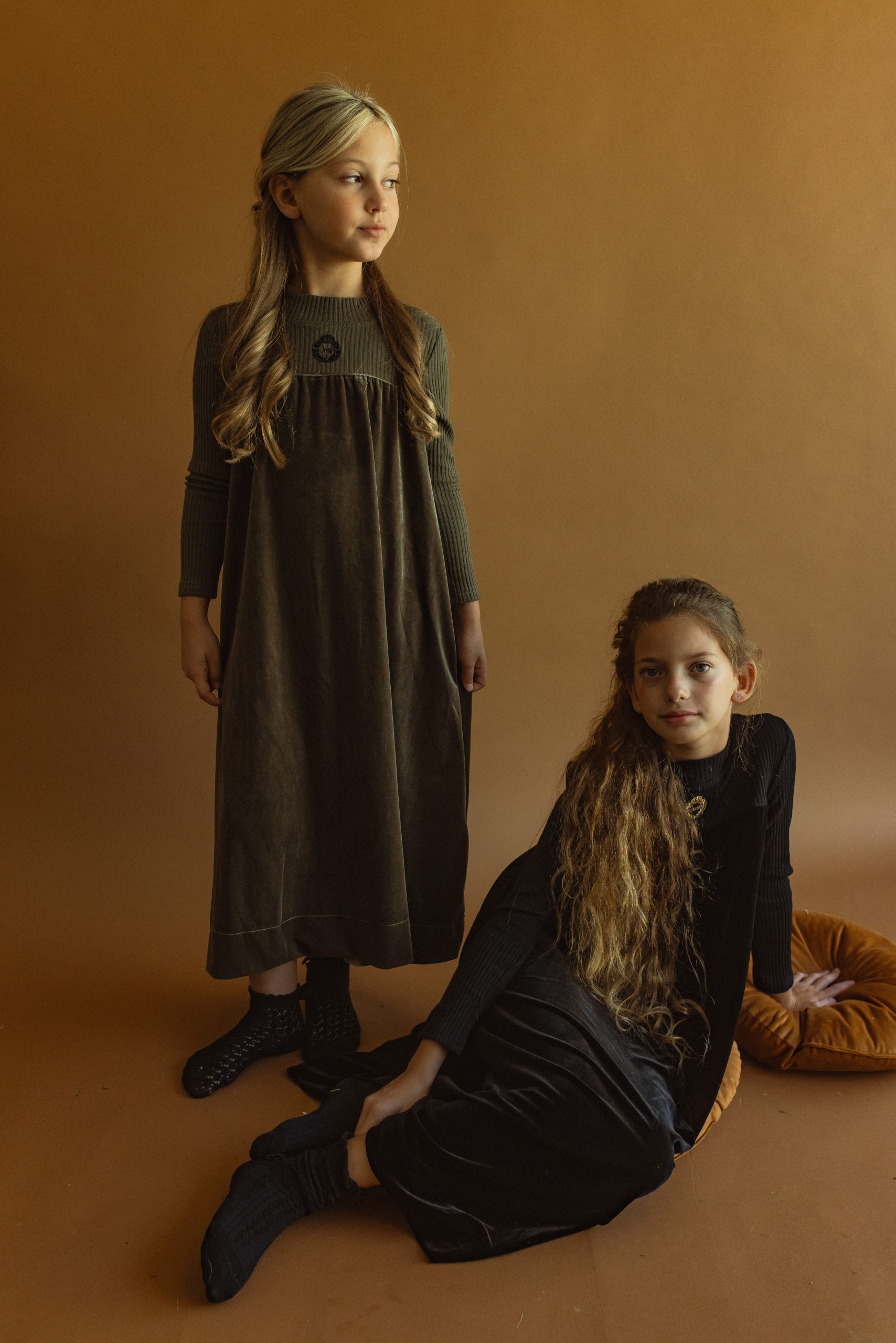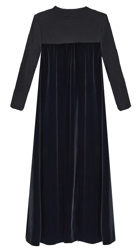 חלוק קטיפה שבתי בצבע שחור עם פאטצ של לוגו המותג, חתך גבוה.